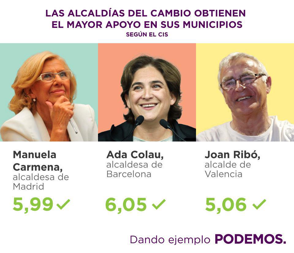 Ada Colau, Manuela Carmena y Joan Ribó los políticos mejor valorados según el CIS.